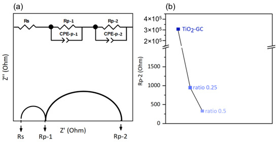 (a) Example of a Nyquist plot and illustration of the equivalent circuit model used in this study (Z′ = ReZ and Z″ = −ImZ) and (b) charge transfer resistance Rp-2.