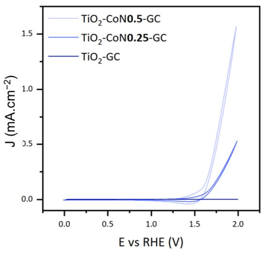 For the maximum current intensities collected at 2 V, we saw a considerable improvement with the presence of cobalt: as the cobalt ratio increased, the current rose from 0.041 mA.cm−2 for the TiO2 to 0.529 mA.cm−2 for the 0.25 ratio, then to 1.570 mA.cm−2 for the 0.5 ratio.