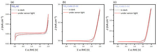 Cyclic voltammetry curves in dark and under xenon light for (a) TiO2-GC, (b) TiO2-CoN0.25-GC, and (c) TiO2-CoN0.5-GC samples.