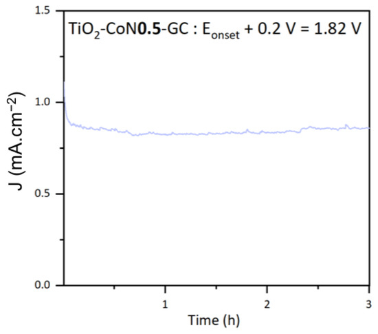 The stability of the thin films was examined using photocurrent measurements. The stability of the top-performing TiO2-CoN0.5 sample is shown in Figure 11. The chosen potential was the onset potential +0.2 V, to ensure that non-negligible currents were obtained. At this potential, the thin film current density was stable at about 0.85 mA.cm−2 under xenon irradiation for 3 h. From this curve, the theoretical amount of hydrogen produced, , can be determined by utilizing Faraday’s law (5).