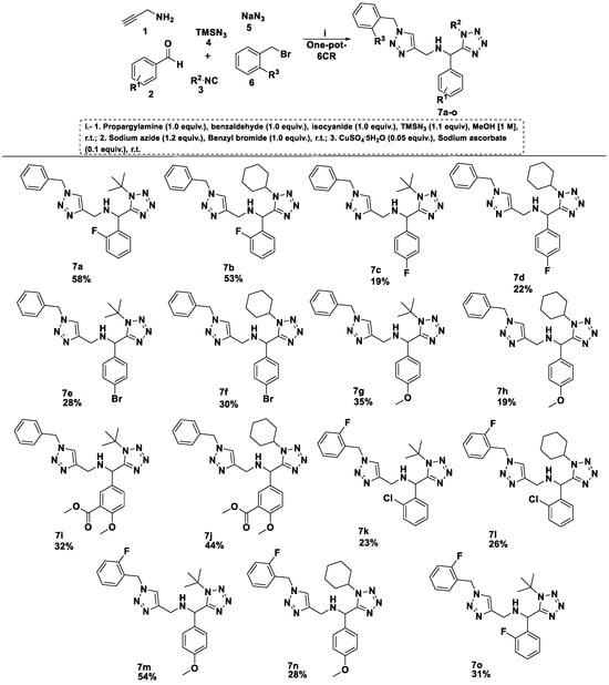 - Aguilar-Morales, C.M.; Río, R.; Islas-Jácome, A.; Gámez-Montaño, R.; Chacón-García, L.; Cortés-García, C. Synthesis of 1,5-disubstituted tetrazole-1,2,3 triazoles hybrids via Ugi-azide/CuAAC. Synth. Commun. 2022, 53, 127–134. [Google Scholar] [CrossRef]