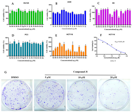 Compound 3l showed excellent inhibitory activity against different cancer cell lines (A–E). Proliferation inhibition activity of 3a–3p was assessed by MTT in lung cancer cell (A549), prostate cancer cell (DU145), cervical epithelial cell (H8), prostate cancer cell (PC3), and colon cell (HCT116). These cells were treated with compounds 3a–3p at 10 μM for 48h respectively, then cell viability was measured. (F) IC50 values of compound 3l in HCT116 colon cancer cell lines. (G) Colony formation assay was conducted to evaluate the effects in vitro on the clonogenicity of PC3 cell after treating with different concentrations (0, 5, 10, and 20 μM) of compound 3l for 10 days. The colonies were visualized with the images.
