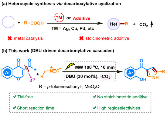 Decarboxylative cyclization reactions are highly efficient strategies for synthesizing high-value organic molecules through the formation of C-C bond to form heterocycles, which serve as crucial structural motifs in a wide range of natural products and biologically active compounds [16,17]. Recently, a palladium-catalyzed three-component decarboxylation of propargylic carbonate used to produce pyrroles was described by Zhu and co-workers [18]. Cao et al. reported decarboxylative cycloaddition of β-ketoacids for synthesis of pyrrole by employing iron as catalysts through a Mannich/decarboxylative process [19]. However, the majority of representative decarboxylative cascades for synthesizing heterocyclic molecules have encountered at least one drawback: (1) a metal catalysis was required; (2) a large excess of additive was necessary; or (3) a highly activated substrate was involved (Scheme 1a). Therefore, a method capable of operating with a broad functional group tolerance and employing a catalytic amount of additive without transitional metals would be highly desirable.