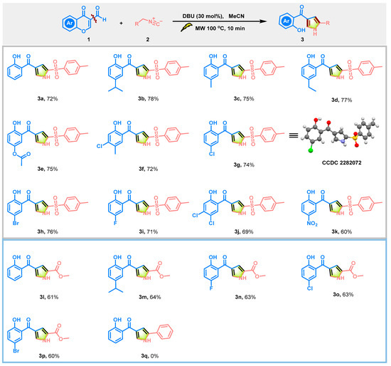 Using the optimized reaction conditions, we evaluated the generalizability of DBU-mediated direct oxidation/decarboxylation for accessing substituted pyrroles by utilizing various 3-formylchromones and isocyanides, as shown in Scheme 2. In contrast, DBU-driven oxidation/decarboxylative [3+2] cycloaddition exhibited high chemoselectivity, and no 2-substituted chromanones were observed [34]. Under the standard reaction conditions, the yields of the 2-tosylxy-4-benzolyoxy pyrroles 3a–3p ranged from 60% to 78%. When TosMIC was used as one of the starting materials, the 3-formylchromones containing electron-donating groups (H, Me, Et, i-Pr, OCOMe) were efficiently converted into the desired compounds 3a–3e. Furthermore, the 3-formylchromones containing electron-withdrawing groups (F, Cl, di-Cl, Br) were also tolerated and yielded the final products in moderate to good yields under the optimized reaction conditions. Specifically, compound 3g (CCDC 2282072, see Figure 2) was isolated and its structure was determined by X-ray analysis, as shown in Scheme 2. However, using 6-nitrochromone-3-carboxaldehyde for the synthesis of compound 3k afforded a diminished yield. To our surprise, the reported protocols for pyrrole synthesis commonly utilize either methyl isocyanoacetate or TosMIC. To the best of our knowledge, isocyanoacetate exhibits similar properties to TosMIC in producing pyrrole analogues. In our protocol, isocyanoacetate served as an effective synthon for generating the 2-methoxycarbonyl-3-benzoyloxy pyrroles through decarboxylative [3+2] cycloaddition (3l–3p). The different substitutions on the phenyl ring of chromone-3-carboxaldehyde have little or no effect on the yield. Regrettably, DBU-mediated oxidation/decarboxylative [3+2] cycloaddition using benzyl isocyanide with inactive methylene as a substrate for obtaining compound 3q was found to be unfeasible, as shown in Scheme 2.