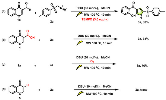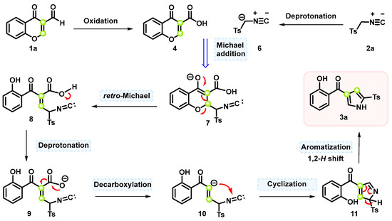 Based on the experimental results presented above and relevant reports in the literature, a possible mechanistic pathway for the formation of pyrroles is proposed in Scheme 4. 3-Formylchromone is oxidized using microwave irradiation with air as the exclusive oxidant. Under basic reaction conditions, deprotonation of 2a gives rise to the nucleophilic carbanion 6. Intermediate 7 is formed through a retro-Michael addition reaction, followed by γ-pyrone ring opening to yield intermediate 8 [35]. This structure 8 further undergoes deprotonation for intermediate 9 and decarboxylation to yield intermediate 10. To the best of our knowledge, isocyanide is a well-known zwitterionic compound that can act as a nucleophile trap. The isocyano group of 10 undergoes intramolecular α-nucleophilic addition to yield the pyrrole precursor 11 [36]. Finally, the 1,2-H shift process of compound 11 leads to the aromatization and the formation of the desired product 3a.