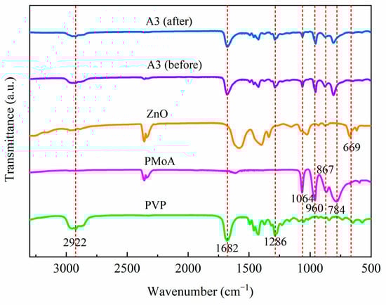 Figure 1 shows the FTIR spectra of PVP, PMoA, ZnO, and PMoA/ZnO/PVP composite film before and after visible light irradiation. The characteristic peaks of PVP were located at 2922 cm−1, 1682 cm−1, and 1286 cm−1, corresponding to C-H, C=O and C-N bonds, respectively [4,16,28]. PMoA had four characteristic peaks at 1064 cm−1, 960 cm−1, 867 cm−1, and 784 cm−1, which represented υ(P-O), υ(Mo-Od), υ(Mo-Ob-Mo), and υ(Mo-Oc-Mo) in the Keggin structure, respectively [29,30]. The characteristic peak of ZnO was located at 669 cm−1, indicating the υ(Zn-O) bond [31,32]. Comparing the spectra of PMoA/ZnO/PVP A3 (before) with PVP, PMoA, and ZnO, it was found that the characteristic peaks of PVP, PMoA, and ZnO could all be observed in the A3 (before) spectra, which indicated that PVP, PMoA, and ZnO were successfully synthesized into A3 composite film. In addition, according to the A3 (after) spectra, it can be seen that the characteristic peaks of the three materials, PVP, PMoA, and ZnO, still exist after illumination, which testified that the composition of A3 film did not change after illumination. However, compared to the peak positions of Mo-Ob-Mo vibration and Mo-Oc-Mo vibration in the composite film before illumination, the peak positions of Mo-Ob-Mo vibration (867 cm−1) and Mo-Oc-Mo vibration (784 cm−1) were blueshifted (5 cm−1) and redshifted (2 cm−1), respectively, after illumination. Also, the characteristic peak of ZnO (669 cm−1) underwent a little blue shift (1 cm−1). Owing to the strong non-chemical bonding interactions between the two phases of PMoA and ZnO in the PMoA/ZnO/PVP composite film, this shifted the positions of the characteristic peaks of PMoA and ZnO. The study on PMoA/ZnO photochromism by Sun et al. [25] also confirmed that this displacement occurred due to the interaction between PMoA and ZnO. Under the excitation of visible light, the composite film eventuated a photoreduction reaction, and the heteropolyacid molecule accepted photogenerated electrons to generate heteropolyblue [33].