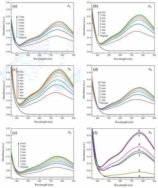 The UV-Vis absorption spectra of the composite films Ai (i = 1, 2, 3, 4, 5) before and after irradiation are shown in Figure 3a–e, and the bleaching process of A3 is depicted in Figure 3f. The absorption peak ranges, absorption saturation times and saturation absorbance values of A1, A2, A3, A4, and A5 under visible light irradiation are exhibited in Table 1.