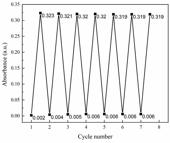 Figure 4 shows the change in light absorption properties of composite film A3 after coloring-fading cycles. The saturated absorbance of the composite film A3 was almost unchanged in seven coloring-fading cycle experiments, which indicated that A3 has excellent, stable and reversible photochromic properties. The composite film was still firmly adhered to the substrate after seven cycles of experiments, indicating that the obtained film had good adhesion and stable physical properties.