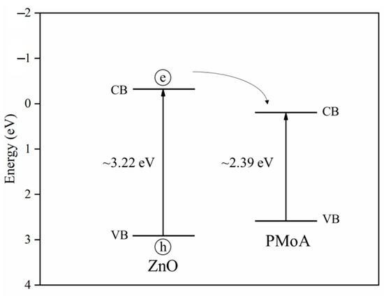 In order to analyze the photocatalytic mechanism, the positions of valence and conduction bands of ZnO and PMoA are depicted in Figure 6 based on previous studies [26,38,39]. The bottom of the valence band of ZnO was significantly lower than that of PMoA, indicating that electrons in ZnO could easily enter into PMoA. The conduction band position of PMoA was lower than that of ZnO, which was conducive to the injection of excited electrons into the conduction band of PMoA. In this reaction, ZnO acted as an electron donor and donated electrons to PMoA under visible light illumination, and so PMoA obtained electrons and underwent a reduction reaction, and Mo6+ was reduced to Mo5+ to generate heteropolyblue [21,22], which is consistent with the conclusion drawn by XPS. Therefore, the photochromic mechanism of the PMoA/ZnO/PVP composite film was based on the electron transfer mechanism. The mechanism of photochromism and the bleaching process of the composite film are shown in Figure 7. ZnO serves as an electron donor providing electrons under the illumination of visible light to deliver electrons to PMoA. Then, PMoA receives electrons and forms heteropolyblues, resulting in a color change in the film (from slight yellow to blue). Conversely, heat is used for treating the heteropolyblue, leading to a bleaching process to restore the original color.