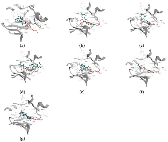 Three-dimensional docking structures with EGFR of the candidate inhibitors (green) (a) TCMIO5312, (b) TCMIO89212, (c) TCMIO90156, (d) TCMIO98874, (e) HMDB0012243, (f) HMDB0014570, (g) HMDB0037450, and Erlotinib (red).