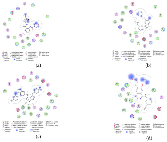 Schematic 2D representations of the interactions between EGFR and (a) TCMIO89212, (b) TCMIO90156, (c) TCMIO98874, and (d) Erlotinib, respectively.