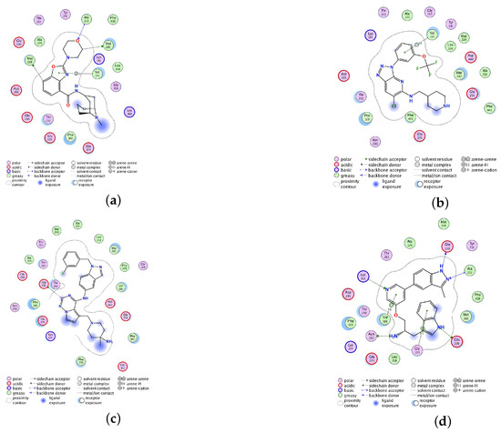 Schematic 2D representations of the interactions between AKT and (a) TCMIO89212, (b) TCMIO90156, (c) TCMIO98874, and (d) A-443654, respectively.