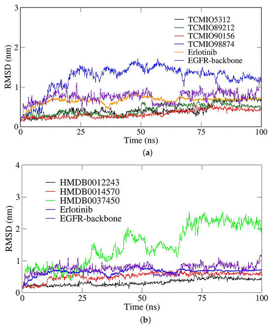 Backbone RMSD of the complexes of EGFR and inhibitor candidates screened from (a) TCMIO and (b) HMDB databases.