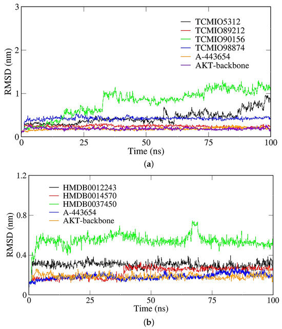 Backbone RMSD of the complexes of AKT and inhibitor candidates screened from (a) TCMIO and (b) HMDB databases.