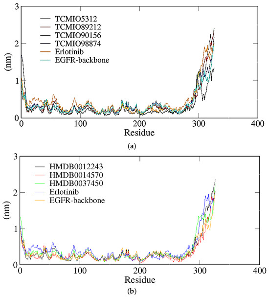 RMSF of the complex structures of EGFR with the TCMIO (a) and HMDB (b) compounds.