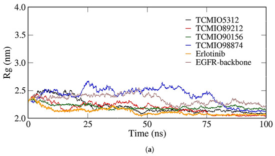 The radii of Gyration (Rg) values were employed to assess the folding rate and the sizes of protein–compound complexes. Rg serves as a critical measure of protein compactness, with higher Rg values indicating lower protein compactness [39]. During the MD simulations, the Rg values were assessed. As depicted in Figure 10, it is evident that the Rg values fluctuated due to the inherent dynamism of the complexes. However, all the Rg values remained within the range of 2.0–2.80 nm, suggesting the absence of significant conformational changes. The complexes formed with TCMIO90156, TCMIO89212, TCMIO98874, TCMIO5312, HMDB0012243, and HMDB0037450 were observed to exhibit tighter structures compared with the Erlotinib complex. This observation suggests that these six compounds had a lesser impact on the tightness of the protein [40].