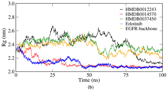 Radii of gyration (Rg) of the complex structures of EGFR with the TCMIO (a) and HMDB (b) compounds.