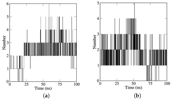 The H-bond module was utilized to determine the number of H-bonds formed between the ligand and receptor throughout the course of the MD simulations [41]. In general, it is expected that a ligand can establish at least two H-bonds with the receptor protein. Upon analyzing the H-bond count for three compounds in relation to EGFR, it is observed that the reference compound (Erlotinib) formed a maximum of four H-bonds during the 100 ns simulations. However, TCMIO98874, TCMIO5312, TCMIO90156, and TCMIO89212 were able to form a maximum of six, five, four, and three H-bonds with EGFR, respectively (Figure 11). As H-bond interactions are crucial in intermolecular binding, it was anticipated that TCMIO98874, TCMIO5312, and TCMIO90156 would exhibit efficient binding with EGFR [42].