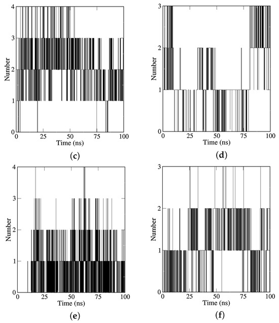 Numbers of intermolecular hydrogen bonds of (a) TCMIO98874, (b) TCMIO5312, (c) TCMIO90156, (d) TCMIO89212, (e) Erlotinib, and (f) EGFR-backbone binding to EGFR from 100 ns MD simulations.