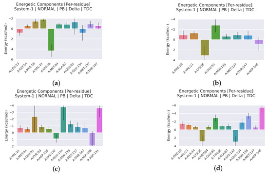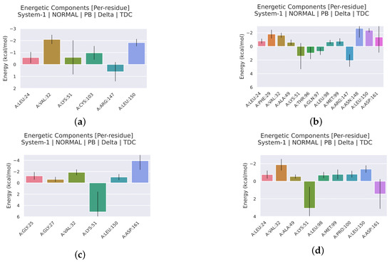 MMPBSA energy residue decomposition analysis of (a) TCMIO89212, (b) TCMIO90156, (c) TCMIO98874, and (d) A-443654 with AKT.