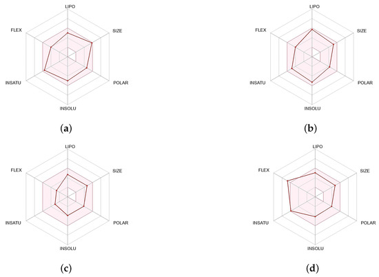 The structures of the compounds were converted into the simplified molecular input line input system (SMILES) format. Subsequently, the documents were submitted to http://www.swissadme.ch/ (accessed on 7 March 2023) SwissADME [60] to evaluate the metabolism, excretion, distribution, toxicity, and absorption characteristics of small molecules.