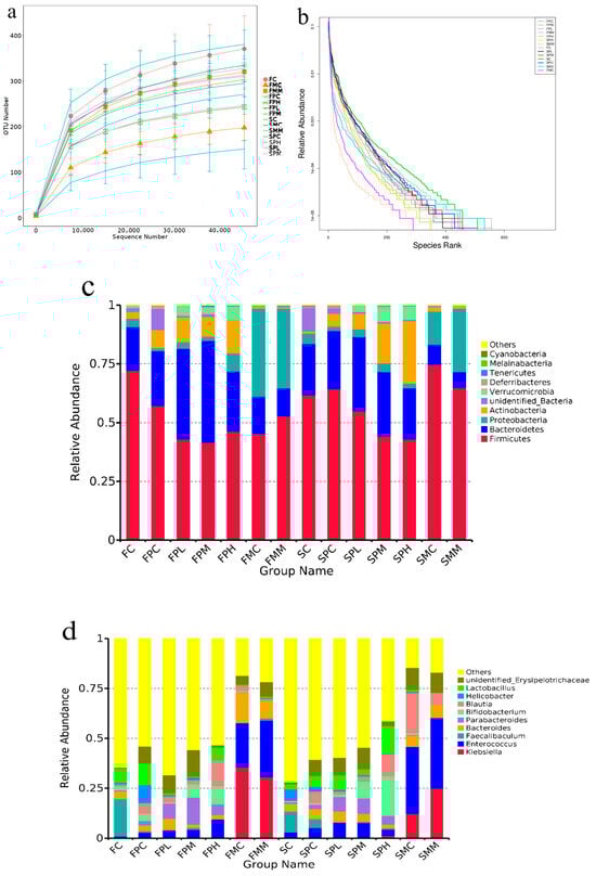 To explore the effects of ampicillin and GOS on the intestinal microbiota, we performed 16S rRNA sequencing. Rarefaction and rank curves are commonly used to describe sample diversity within a group. The rarefaction curve (Figure 1a,b) directly reflected the sufficiency of the amount of sequencing data and indirectly reflected species richness in samples. As the curve flattens, the increase in the amount of sequencing data gradually decreases, and the inclusion of more data produces only a small number of new species (OTUs). From species annotation analyses, the top 10 species with the highest abundance in each sample or group at each classification level (phylum and genus) were selected, and a column of the relative species abundance was generated to view each sample at different taxonomic levels. Then, relatively abundant species and their proportions were identified [19]. At the phylum level (Figure 1c), the intestinal microbiota mainly consisted of Firmicutes, Bacteroidetes, Proteobacteria, and Actinobacteria. Genus-level differences were identified after 8 and 12 weeks of GOS intake (Figure 1d). At Week 8, the relative abundance of Firmicutes in the intestinal microbiota of all antibiotic-treated groups relative to non-antibiotic groups decreased, and the relative abundance of Actinobacteria increased. Compared with the control group, the relative abundance of Firmicutes in the FPC, FPL, FPM, and FPH groups after penicillin treatment decreased by 20.83%, 45.41%, 42.36%, and 36.11%, respectively. The relative abundance of Bacteroidetes in the FPC, FPL, FPM, and FPH groups increased by 27.22%, 108.11%, 134.05%, and 37.83%, respectively. The relative abundance of Actinobacteria in the FPC, FPL, FPM and FPH groups increased by 175%, 274.28%, 201.04%, and 403.93%, respectively. The relative abundance of Proteobacteria in the FPC, FPL and FPM groups decreased by 66.67%, 22.22%, and 49.45%, respectively, while the relative abundance in the FPH group increased by 113.89%. In addition, after penicillin treatment, the relative abundance of Firmicutes in the GOS group showed a downward trend regardless of whether the low, medium, or high dose was used. A possible explanation for this was that penicillin inhibits chitosan synthesis in Gram-positive bacteria cell walls, thus inhibiting growth. Firmicutes are Gram-positive bacteria, so their numbers were reduced. The dominant bacterial composition of FMC and FMM groups treated with mixed antibiotics was similar at the phylum level and mainly consisted of Firmicutes, Bacteroidetes, and Proteobacteria.