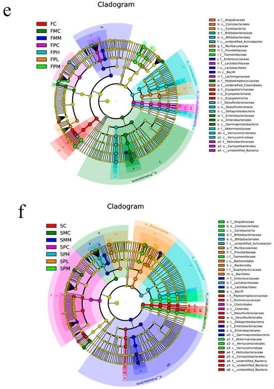 Figure 1. Intestinal microbiota composition after GOS supplementation with ampicillin exposition. (a) Rarefaction curve; (b) Rank curves; (c) Relative contribution of the top 10 phyla in each group; (d) Relative contribution of the top 10 genera in each group; (e,f) Taxonomic cladogram from LEfSe at 8 and 12 weeks, (n = 4). Biomarker taxa are highlighted with colored circles and shaded areas. Circle diameters reflect taxa abundance in the community. A cut-off value of ≥4.0, used for linear discriminant analysis (LDA), is shown. F 8 weeks, S 12 weeks.