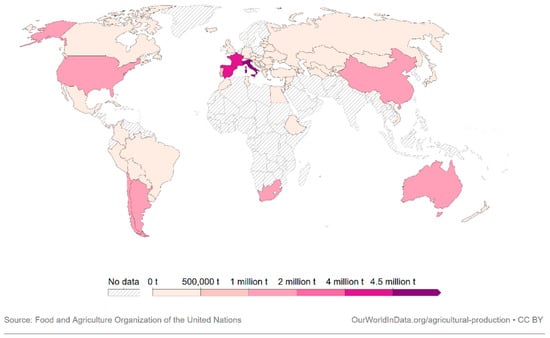 - Our World in Data. Available online: https://ourworldindata.org/grapher/wine-production (accessed on 29 August 2023).
