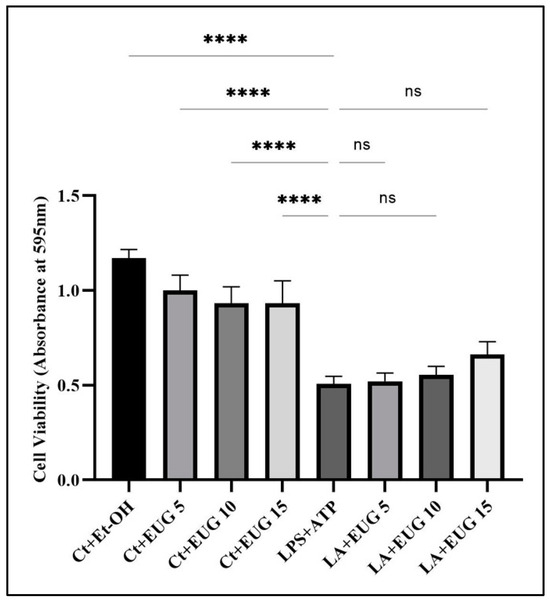 Impact of eugenol treatment on the viability of LA-induced macrophages. THP-1 macrophages were seeded in a 96-well plate and pretreated with three different doses of eugenol before incubation with LPS and ATP, as described elsewhere (see Methods). The treated cells were then incubated with MTT reagent for 4 h, followed by the addition of a resolving solution. The data are shown as the mean value with SD, n = 3. The abbreviations used in the figure are as follows: Ct + Et-OH (control + ethanol) and LA (LPS + ATP). The asterisks show significant difference: 4 asterisks—p < 0.0001; ns—nonsignificant.
