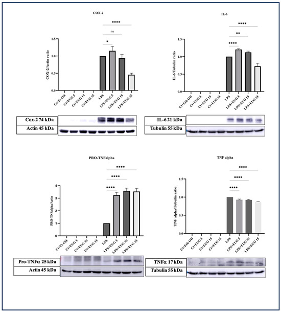 The Western blot analysis of IL-6, TNF-α, and COX-2 in THP-1 macrophages in response to eugenol. THP-1 macrophages pretreated with eugenol were exposed to LPS for 4 h, followed by cellular lysate preparation for Western blot analysis. Eugenol reduced the levels of IL-6 mature TNF-α. All data are presented as mean value +/− SD, n = 3 measurements. Abbreviation: Ct + Et-OH (control + ethanol), Ct + EUG (control + eugenol), LPS + EUG (LPS + eugenol). The asterisks show significant difference: one—p < 0.05; two—p < 0.01; four—p < 0.0001; ns—nonsignificant.