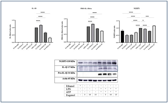 Western blot analysis of pro-IL-1β, mature IL-1β, and NLRP3 in response to eugenol in both LA-induced and uninduced THP-1 macrophages. The response of pro-IL-1β, mature IL-1β, and NLRP3 proteins to three doses of eugenol in both LA-induced and uninduced THP-1 macrophages was determined by Western blot analysis. All data are presented as mean value +/− SD, n = 3 measurements. Abbreviation: Ct + Et-OH (control + ethanol), Ct + EUG (control + eugenol), LPS + EUG (LPS + eugenol), LA (LPS + ATP). The asterisks show significant difference: three—p < 0.001, four—p < 0.0001; ns—nonsignificant.