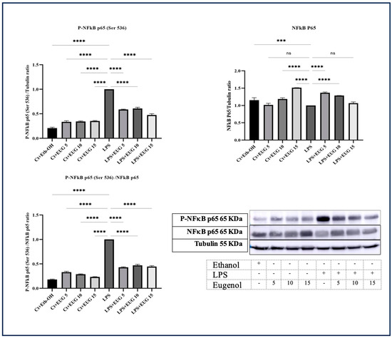 Western blot analysis of P-NF-κB P65 (Ser536), NF-κB P65, and P-NF-κB P65 (Ser536)/NFκB P65 in LA-induced and uninduced THP-1 macrophages treated with eugenol. Western blot analysis was performed to determine the impact of eugenol on the levels of P-NF-κB P65 (Ser536) and P-NF-κB P65 (Ser536)/NF-κB P65 in THP-1 macrophages induced by LPS. All data are presented as mean value ± SD, n = 3 measurements. Abbreviation: Ct + Et-OH (control + ethanol), Ct + EUG (control + eugenol), LPS + EUG (LPS + eugenol). The asterisks show significant difference, where three—p < 0.001; four—p < 0.0001; ns—nonsignificant.