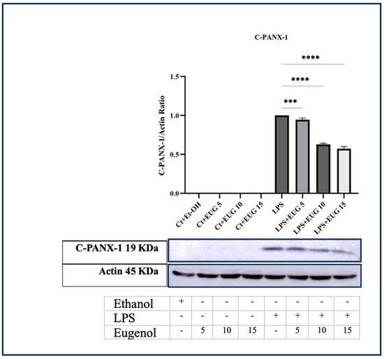 The response of cleaved PANX-1 (C-PANX-1) to three doses of eugenol in both LA-induced and uninduced THP-1 macrophages. Western blot analysis was performed to determine the effect of eugenol on the elevated level of C-PANX-1 (PANX-1 C-terminal) in THP-1 macrophages stimulated with LPS. All data are presented as mean value ± SD, n = 3 measurements. Abbreviation: Ct + Et-OH (control + ethanol), Ct + EUG (control + eugenol), LPS + EUG (LPS + eugenol). The asterisks show significant difference, where three—p < 0.001; four—p < 0.0001.