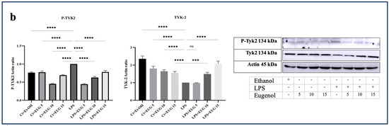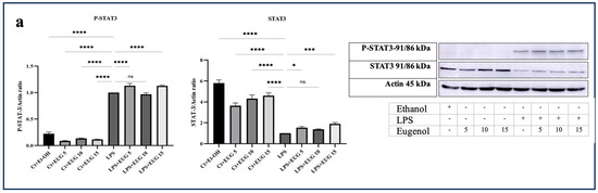 In spite of the inhibitory impact of eugenol on IL6/TYK2, it did not mitigate the phosphorylation of STAT3 in LPS-induced macrophages (Figure 6a). Given that STAT3 plays a role in the production of certain proinflammatory cytokines, including IL-23 and IL-17, the impact of eugenol on the production of these proinflammatory cytokines should be tested to provide additional support for our results.