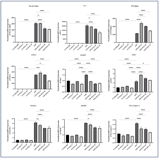 The qRT-PCR analysis of IL-1β, IL-6, pro-TNFα, COX-2, NLRP3, PANX-1, P2X7, ADAR-1, and Pro-Caspase-1 in response to eugenol in both LPS-induced and uninduced THP-1 macrophages. The normalized mRNA expression levels of IL-1β, IL-6, pro-TNFα, COX-2, NLRP3, PANX-1, P2X7, ADAR-1, and Pro-Caspase-1 were assessed in response to three doses of eugenol in both LPS-induced and uninduced THP-1 macrophages. GAPDH and β-Actin were used as control genes to normalize the transcript levels. All data are presented as mean value ± SD, n = 3. Abbreviations: Ct: control, Meth: methanol, EUG: eugenol, Et-OH: ethanol. The asterisks show significant difference: one—p < 0.05; two—p < 0.01; three—p < 0.001; four—p < 0.0001; ns—nonsignificant.