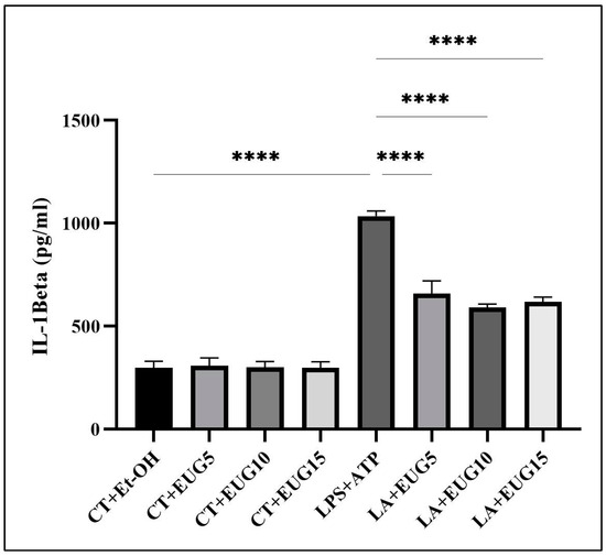 To establish a correlation between the Western blot analysis results for the mature form of IL-1β and the secretion of IL-1β in the medium, an ELISA assay was conducted. Consistent with the impact observed on the mature form of IL-1β, all three doses of eugenol led to a profound reduction in the elevated level of active IL-1β secreted in the medium by LA-induced THP-1 macrophages (Figure 8).