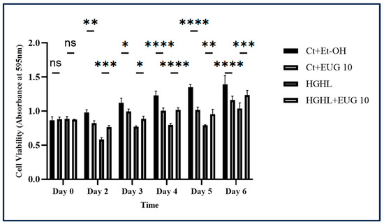In order to investigate whether eugenol can prevent or decrease the HG-HL-induced β-cell loss, an MTT assay was employed using four treatments: control + ethanol (Ct + Et-OH), control + eugenol 10 μM (Ct + EUG 10), HG-HL, and HG-HL + eugenol 10 μM (HG-HL + Eug10). The administration of 10 μM eugenol resulted in a notable enhancement in cell viability in β-cells under HG-HL conditions (Figure 9). Our findings demonstrate that 10 μM eugenol mitigates HG-HL-induced β-cell loss for a duration of 6 days. Interestingly, 10 μM eugenol decreased the viability of β-cells in the Ct + EUG10 group as compared to Ct + Et-OH (Figure 9). It is noteworthy that the initial cell viability in the 96-well plate was uniform, indicating that an equal quantity of cells was introduced into each well on day 0.