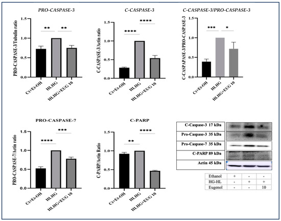 The Western blot analysis of some crucial apoptotic biomarkers in response to eugenol. INS-1 832/13 rat insulinoma cells were incubated with 10 μM eugenol and/or HG-HL conditions for 48 h, followed by cell lysate preparation for subsequent Western blot analysis. The response of pro-caspase-7, pro-caspase-3, C-caspase-3, C-PARP, and the C-caspase-3/pro-caspase-3 ratio to 10 μM eugenol in both HG-HL-induced and uninduced β-cells was determined using Western blot analysis. All data are presented as the mean value ± SD, n = 3 measurements. Abbreviations: Ct + Et-OH (control + ethanol), HG-HL (high glucose-high lipid), EUG (eugenol). The asterisks show significant difference: one—p < 0.05; two—p < 0.01; three—p < 0.001; four—p < 0.0001; ns—nonsignificant.