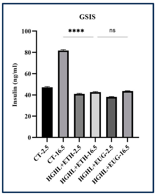 The results of GSIS assay conducted on HG-HL-induced β-cells treated with 10 μM eugenol. The GSIS response of HG-HL-induced β-cells to eugenol in medium containing 2.5 mM glucose (to simulate fasting blood glucose) and 16.5 mM glucose (to simulate postprandial blood glucose) was conducted as detailed in “Materials and Methods”. All data are presented as the mean value ± SD, n = 3 measurements. Abbreviations: Ct + Et-OH (control + ethanol) and HG-HL (high glucose-high lipid), EUG (eugenol). The asterisks show significant difference: four—p < 0.0001; ns—nonsignificant.