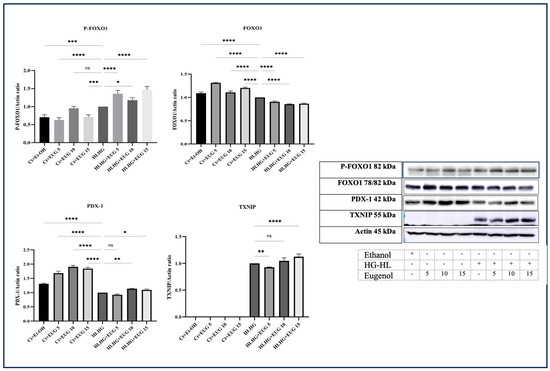 The Western blot analysis of P-FOXO1, FOXO1, PDX-1, and TXNIP in response to eugenol in both HG-HL-induced and uninduced β-cells. The Western blot analysis was conducted to determine the levels of P-FOX1, FOX1, PDX-1, and TXNIP in HG-HL-induced and uninduced β-cells in response to eugenol. All data are presented as the mean value ± SD, n = 3 measurements. Ct + Et-OH (control + ethanol) and HG-HL (high glucose-high lipid), EUG (eugenol). The asterisks show significant difference: one—p < 0.05; two—p < 0.01; three—p < 0.001; four—p < 0.0001; ns—nonsignificant.