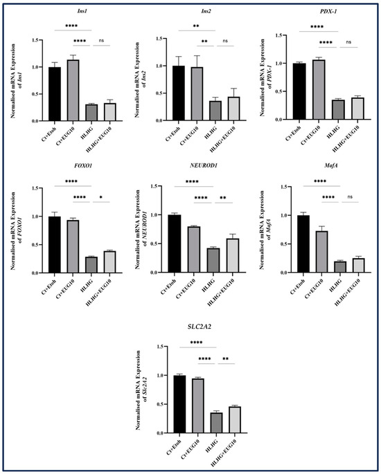 The response of key transcripts involved in β-cell dedifferentiation to 10 µM eugenol in both HG-HL induced and uninduced β-cells. The normalized mRNA levels of Ins1, Ins2, PDX-1, FOXO1, NEUROD1, MafA, and SLC2A2 in both HG-HL-induced and uninduced β-cells treated with 10 µM eugenol were measured using qRT-PCR. α-Tubulin was used as control gene to normalize the transcript levels. All data are presented as the mean value ± SD, n = 3. Abbreviations: Ct + Et-OH (C=control + ethanol) and HG-HL (high glucose-high lipid), EUG (eugenol). The asterisks show significant difference: one—p < 0.05; two—p < 0.01; four—p < 0.0001; ns—nonsignificant.