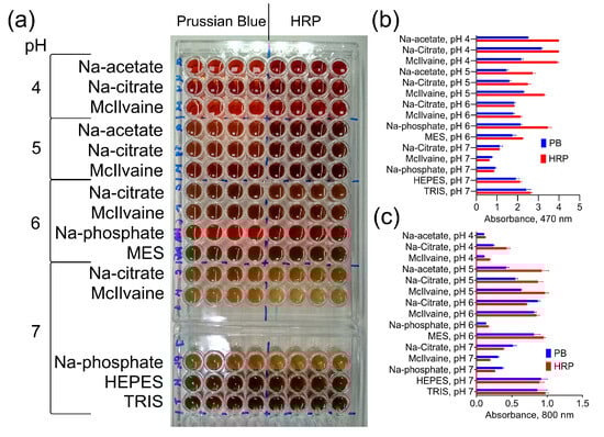 The catalytic activity of Prussian Blue and HRP at various pH levels in different buffers was compared. The oxidation degree was measured by monitoring the absorbance at 470 nm, while absorbance at 800 nm (turbidity) indicated the formation of DAB polymer species. In general, the effect of buffer composition on DAB oxidation was similar for both catalysts (Figure 2). However, when compared to Prussian Blue, peroxidase produced higher absorbance values at pH 4 and 5 but not at pH 6 and 7. This suggests that the difference in the color intensity of the reaction product is influenced by the buffer composition rather than the concentration of the catalysts.