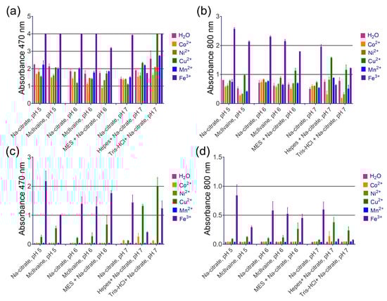 The effect of metal cations on the intensity of DAB oxidation. (a,b) Absorbance of substrate at 470 and 800 nm after the addition of PB@Gel/Str. (c,d) Absorbance of substrate at 470 and 800 nm before the addition of PB@Gel/Str. Mean ± SD, n = 2. The final concentration of Me2+/3+ in the substrate was 0.8 mM. The molarity of all buffers was 33 mM. Nine parts of MES, HEPES, and Tris–HCl buffers were mixed with one part of Na-citrate buffer with the same pH prior to the experiment.