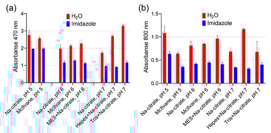 The effect of imidazole on the intensity of DAB oxidation. (a) Absorbance of reaction products at 470 nm. (b) Absorbance of reaction products at 800 nm. The final concentration of imidazole was 10 mM. Before being added to the buffer, the pH of the imidazole solution was adjusted using HCl to match the pH of the buffer. The molarity of all buffers was 33 mM. Nine parts of MES, HEPES, and Tris–HCl buffers were mixed with one part of Na-citrate buffer with the same pH prior to the experiment. Mean ± SD, n = 2.