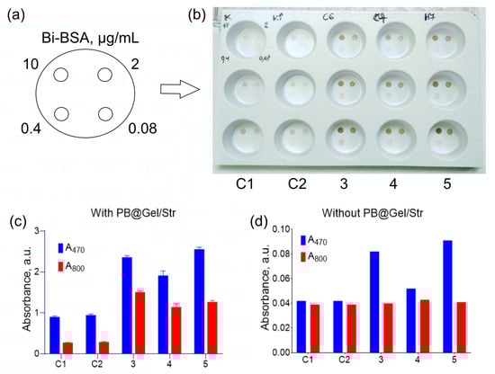 Based on the aforementioned experiments, for a comparative study, 30 different substrate compositions (Table S1) were formulated. Solutions with varying concentrations of Bi-BSA were dotted onto wells of white opaque polystyrene plates, and the adsorbed Bi-BSA was detected using PB@Gel/Str and DAB substrates (Figure S13). To measure the signal intensity, images of the wells after the assay were captured and analyzed using ImageJ software (https://imagej.net/ij/index.html, accessed on 22 June 2023). However, due to the non-homogeneous coloring of the spots, the results of the image analysis were inaccurate. Therefore, the best substrates were selected based on both image analysis and a visual assessment of the wells (Figure S14). Consistent with the intensity of the colored spots in the immunoassay, we also evaluated the spontaneous oxidation of the DAB substrates in 96-well plates by measuring A470 and A800 ten minutes after their preparation (Figure 6d).