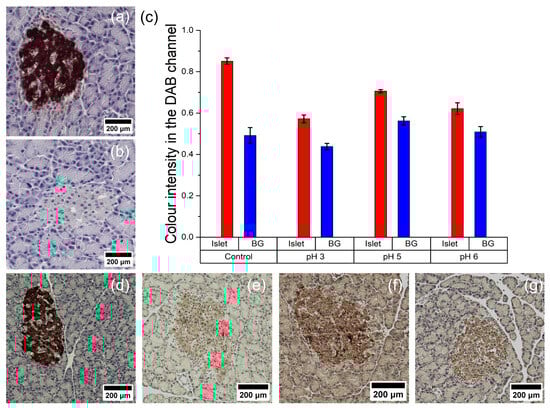 Immunohistochemical staining of pancreatic islets with horseradish peroxidase (a,d) and Prussian Blue nanoparticles (b,e–g). (c) Data on staining intensity obtained after digital processing of histological images taken with different DAB solutions (BG—background). Commercial DAB solution (a–d) or 100 mM Na-citrate buffer with 1 mg/mL DAB, 1 and 0.1% H2O2, pH 3 (e), pH 5 (f), or pH 6 (g) were used for staining.
