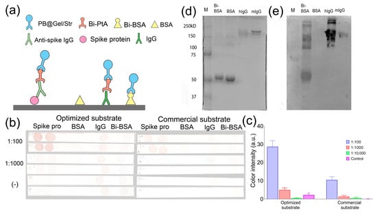 We performed gel electrophoresis of mouse IgG, human IgG, BSA, and Bi-BSA in an 8% polyacrylamide gel. The proteins were then transferred from the gel to nitrocellulose membranes and treated sequentially with biotinylated Staphylococcal protein A (Bi-PtA), PB@Gel/Str, and the optimized DAB substrate. An identical gel was stained with the protein dye Coomassie Brilliant Blue. Protein A binds to both human and mouse antibodies [38], and the biotin tag facilitates its interaction with PB@Gel/Str. Bi-BSA and BSA were used as positive and negative controls, respectively. The results of the Western blotting demonstrate the successful detection of both antibodies and Bi-BSA, while no colored spot was observed in the BSA lane (Figure 8d,e).