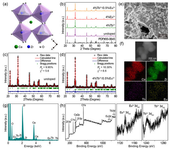 (a) Crystal structure diagram of CaZrO3. (b) Powder XRD patterns of representative undoped CaZrO3, CaZrO3:4%Tb3+, CaZrO3:4%Eu3+, and CaZrO3:4%Tb3+/0.5%Eu3+. The bars at the bottom are the reference standard patterns of CaZrO3 (PDF card No. 35–0645). Rietveld refinement results of (c) undoped CaZrO3 and (d) CaZrO3:4%Tb3+/0.5%Eu3+. (e) SEM image and (f) elemental mapping of CaZrO3:4%Tb3+/0.5%Eu3+. (g) EDS spectrum of CaZrO3:4%Tb3+/0.5%Eu3+. (h) XPS spectra of CaZrO3:4%Tb3+/0.5%Eu3+: the overall spectrum, high resolution spectra of Eu 3d and Tb 3d.