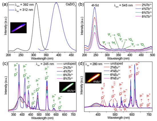 Doping Tb3+ or Eu3+ ions into CaZrO3 changed the luminescent properties significantly. The excitation spectra of CaZrO3:Tb3+ (2–8%) monitoring Tb3+ emission at 545 nm are presented in Figure 2b. All excitation spectra showed strong and broad excitation bands centered at 245 nm and several weak and narrow excitation peaks in the range of 310–380 nm. These weak and narrow excitation peaks matched a series of Tb3+ 4f–4f transitions well. The intense and broad excitation band could be attributed to the characteristic absorption from the 4f–5d transitions of Tb3+ [53,54]. The completely different excitation band position around 245 nm compared with the main excitation band around 312 nm of undoped CaZrO3 could exclude the host’s absorption of CaZrO3. This was further confirmed by the emission spectra under 312 nm excitation (Figure S3a). Obviously, the intense excitation at 312 nm of undoped CaZrO3 was unable to trigger the luminescence of Tb3+ at all. Furthermore, the almost identical excitation band positions at 245 nm for samples with varied Tb3+ concentrations also opposed the possible Tb3+-doping-induced shift of the host absorption band. Figure 2c compares the emission spectra of CaZrO3:Tb3+ (0–8%) under 245 nm excitation, showing that CaZrO3:Tb3+ (2–8%) presented a series of strong and narrow emission peaks originating from the characteristic 4f–4f transitions of Tb3+. The broad emission bands around 392 nm from the host CaZrO3 still appeared, although the intensity was reduced. This is because the excitation wavelength of 245 nm overlapped with the tail of the excitation band for host emission. The Tb3+ luminescence reached the highest intensity in CaZrO3:4%Tb3+, and concentrations greater than 4% led to a decline in intensity due to concentration quenching. Digital photographs display the bright green luminescence of CaZrO3:Tb3+ (2–8%) (the inset in Figure 2c and Figure S3b).