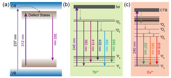 The mechanisms of luminescence from CaZrO3, CaZrO3:Tb3+, and CaZrO3:Eu3+ are summarized and depicted in Figure 3. For CaZrO3, the excitation of electrons from the ground levels to the excited levels of defect states, the subsequent non-radiative transitions to deep defect states, and the following radiative recombinations were the main energy paths, meanwhile weak excitation could also be accessed by the band-gap transitions and the subsequent energy transfer to the defect states (Figure 3a). In CaZrO3:Tb3+, the main mechanism for Tb3+ luminescence was the self-excitation of Tb3+ through 4f–5d transitions followed by the radiative 4f–4f transitions, accompanied by some non-radiative transitions (Figure 3b). As for CaZrO3:Eu3+, the main luminescent mechanism was the excitation by the O2− → Eu3+ charge transfer transitions, which led to the described radiative 4f–4f transitions of Eu3+ (Figure 3c). It is obvious that the main excitation channels for the luminescence from host CaZrO3 and dopants Tb3+ and Eu3+ were completely different, as were the excitation wavelengths.